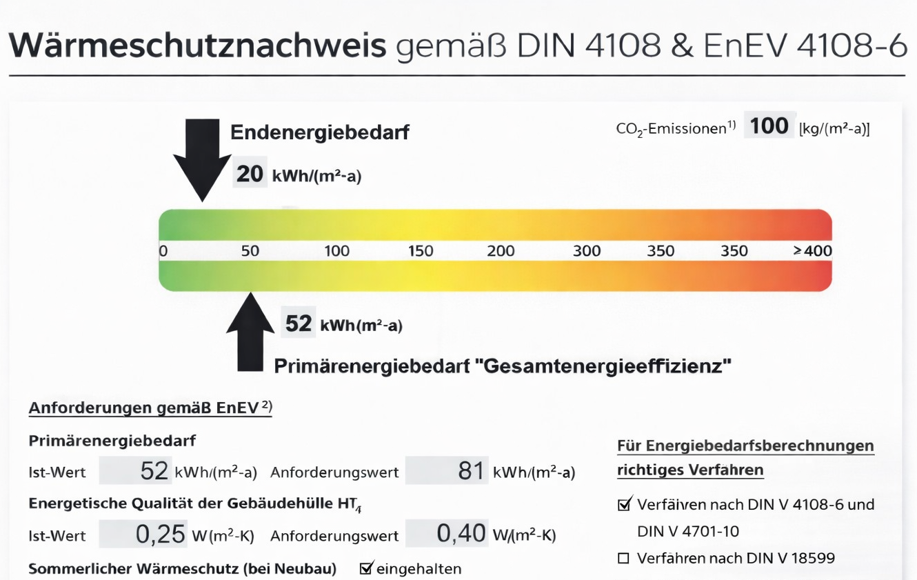 Der Wärmeschutznachweis bestätigt die Einhaltung aller gesetzlichen Anforderungen und zeigt gleichzeitig Optimierungspotenziale auf.
